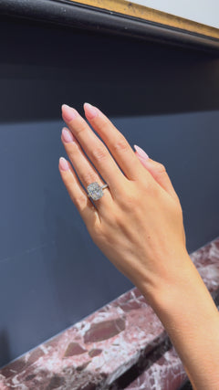 At the heart of this ring, an eight-claw set cushion cut diamond radiates timeless beauty. Round brilliant cut diamonds shimmer along the shank and within the bezels, creating a delicate halo of light, a symbol of enduring love and exquisite craftsmanship.