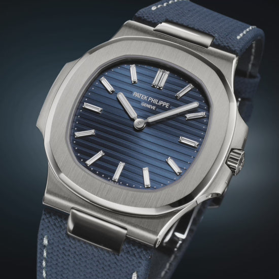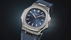 The Manufacture revisits the Nautilus design to mark the collection’s 50th anniversary with a timepiece distinguished by an ultra‑thin white gold case, a sunburst blue dial, and a fabric patterned navy blue composite material strap. Powered by the ultra‑thin self‑winding 240 caliber, this special edition is issued in a limited series of 1,000 pieces.